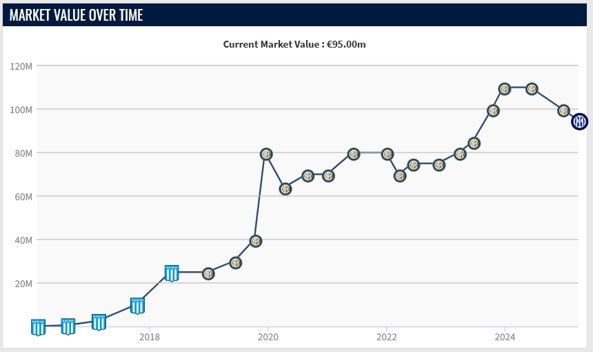 下跌500萬!27歲勞塔羅最新身價(jià)為9500萬歐,最高身價(jià)曾達(dá)1.1億歐