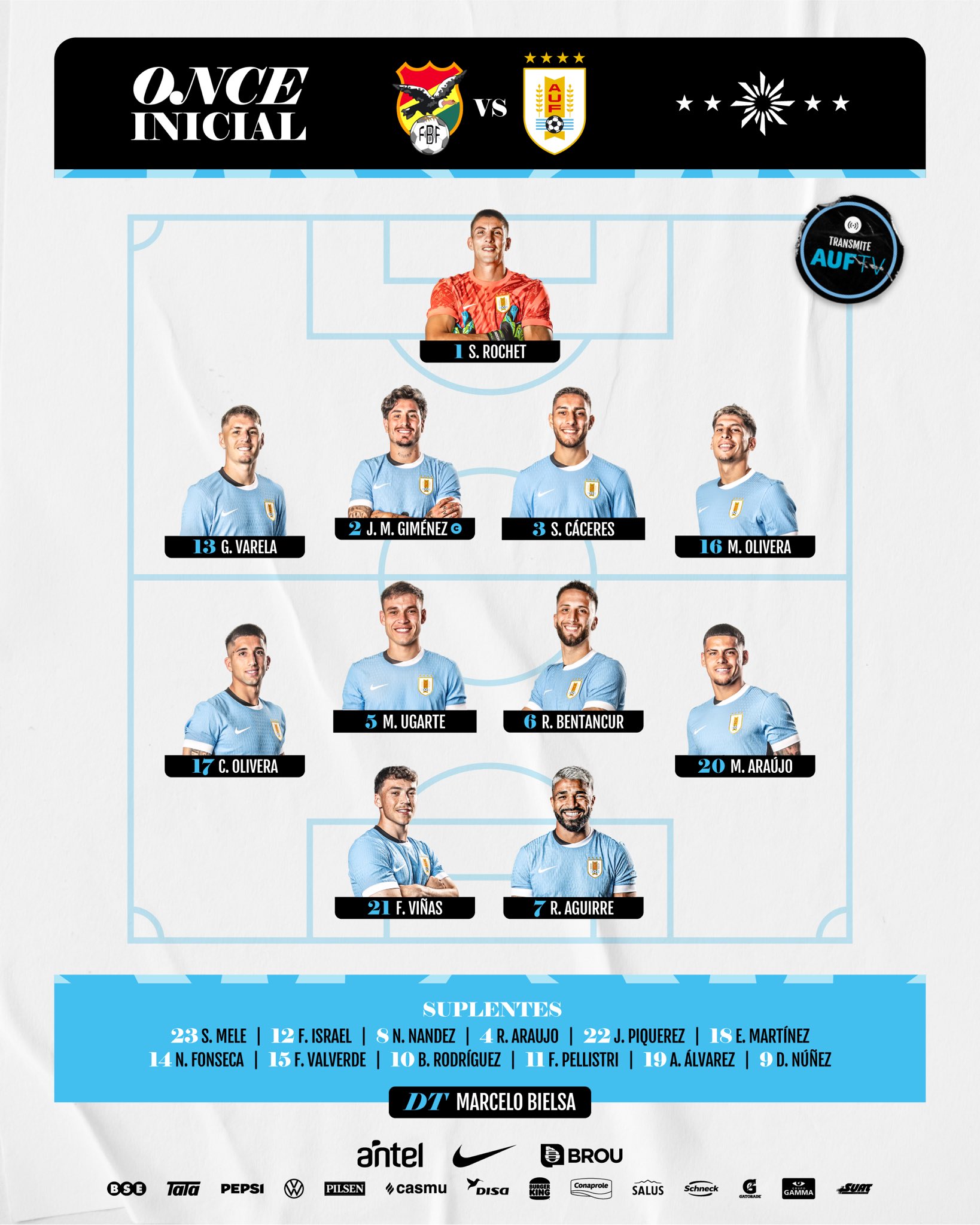 烏拉圭vs玻利維亞首發(fā):巴爾韋德&阿勞霍&努涅斯替補(bǔ),烏加特先發(fā)