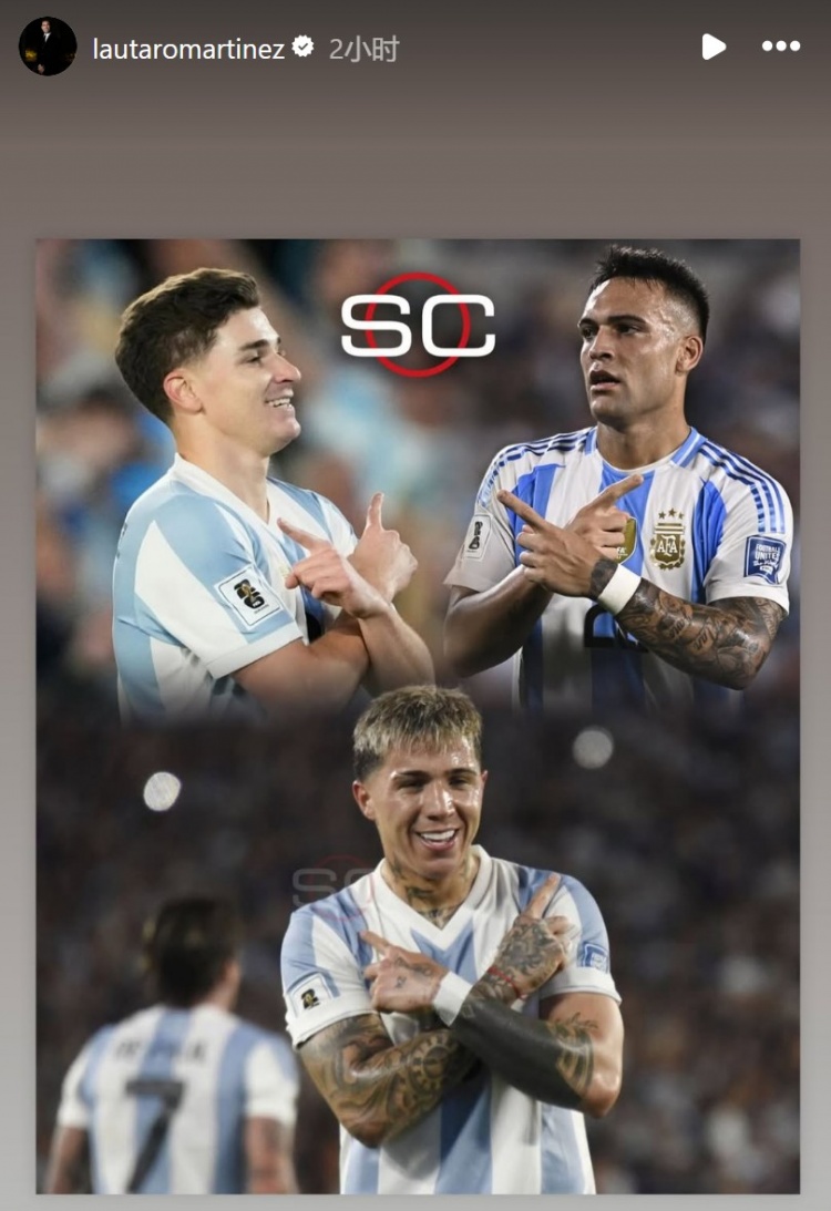 本場比賽勞塔羅因傷缺戰(zhàn),而阿爾瓦雷斯、恩佐在進球后都做出了勞塔羅標志性慶祝動作。勞塔羅也在個人社媒轉發(fā)了三人進球后同樣的慶祝動作照片。