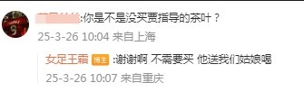 有網(wǎng)友在評論里留言提問“你是不是沒買賈指導(dǎo)的茶葉?”對此王霜回復(fù)寫道:“謝謝啊,不需要買,他送我們姑娘喝?!?/p>