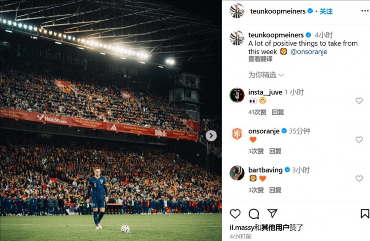 庫(kù)普梅納斯在社交媒體上寫道:“這一周發(fā)生了許多積極的事情?!闭б豢此坪跏菍?duì)莫塔的暗諷,但庫(kù)普梅納斯標(biāo)注了荷蘭隊(duì),并且配圖也是荷蘭國(guó)家隊(duì)的賽場(chǎng)照,因此可以認(rèn)為他是在談?wù)摵商m的歐國(guó)聯(lián)之旅。