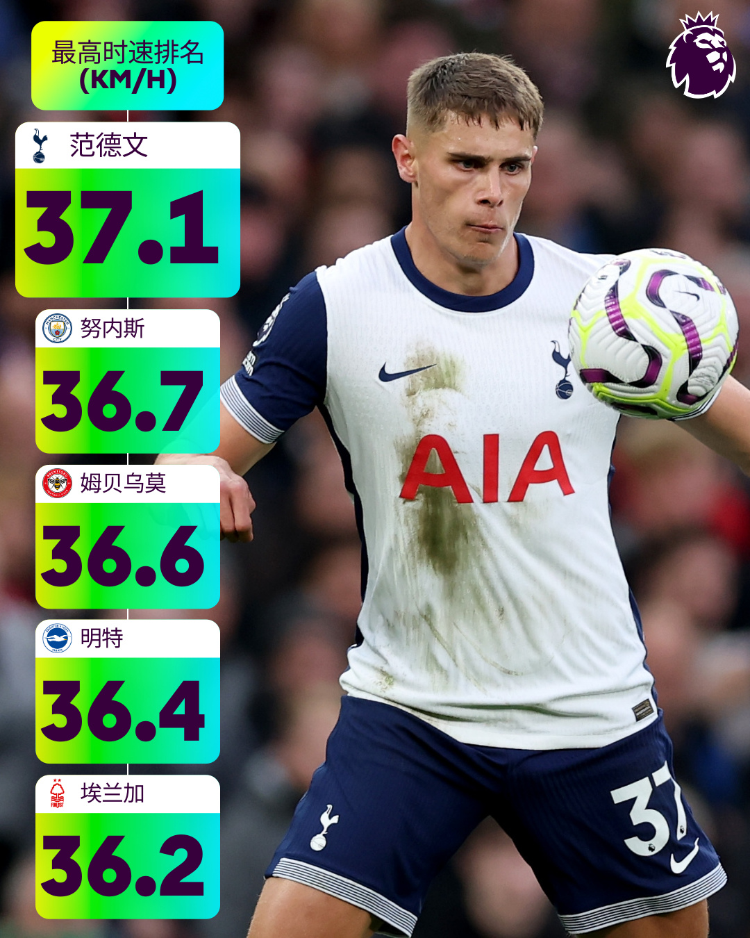 本賽季英超至今球員最高時(shí)速:范德文領(lǐng)跑,努內(nèi)斯、姆貝莫二三