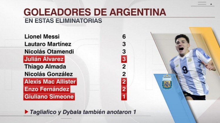 ESPN統(tǒng)計了阿根廷球員本屆世預賽的進球數(shù)量,并列出榜單,梅西以6球居首,勞塔羅、奧塔門迪、阿爾瓦雷斯3球次席。