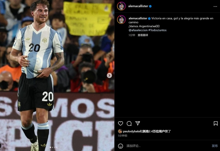 麥卡利斯特曬出破門(mén)后將進(jìn)球獻(xiàn)給懷孕的女友的照片,并寫(xiě)道:主場(chǎng)勝利、取得進(jìn)球,還收獲了旅途中最大的快樂(lè)!加油阿根廷!