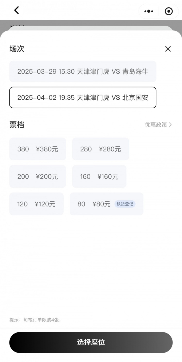 天津津門虎官方售票平臺(tái)信息顯示,本場(chǎng)比賽的門票開票后,僅有80元的最低價(jià)門票顯示缺貨,其他包括120元、160元、200元、280元、380元在內(nèi)的多個(gè)檔位仍有大量余票可供購買。