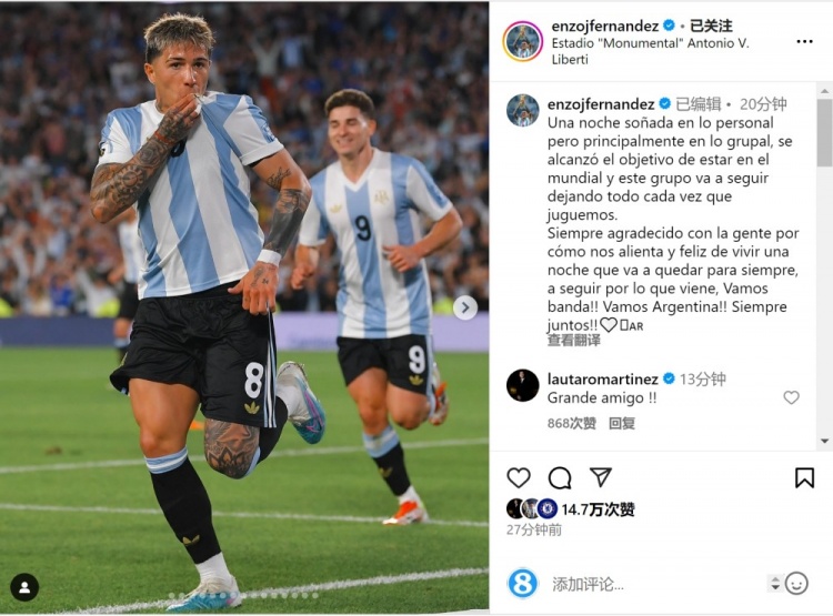 “永遠(yuǎn)感激球迷們對(duì)我們的支持,很高興經(jīng)歷一個(gè)將被永遠(yuǎn)銘記的夜晚。讓我們?yōu)榻酉聛淼奶魬?zhàn)將繼續(xù)努力!加油,兄弟們!加油,阿根廷!永遠(yuǎn)團(tuán)結(jié)一致!