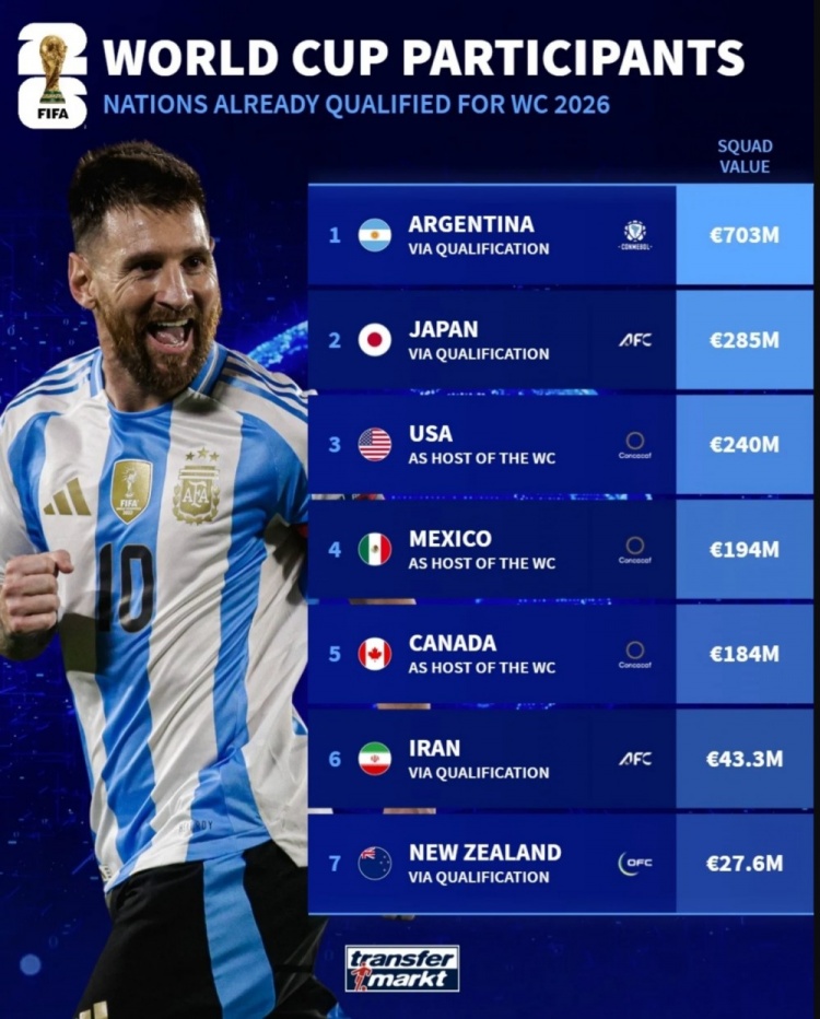 已獲世界杯資格球隊(duì)身價(jià)榜:阿根廷7.03億歐居首,日本、美國前三