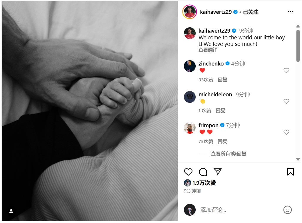喜得貴子!哈弗茨社媒宣布當?shù)簹g迎來到這個世界,我們愛你