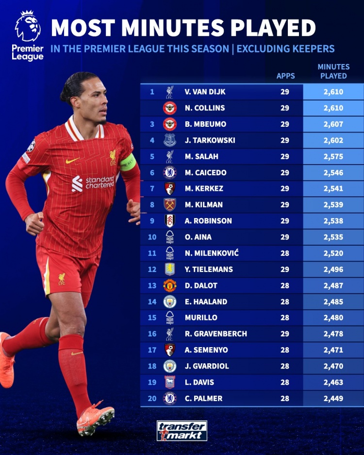3月27日訊 德轉(zhuǎn)統(tǒng)計了本賽季出場時間最多的20名英超外場球員(即非門將球員)。其中,范迪克和科林斯打滿29場比賽居首,薩拉赫第5、凱塞多第6。