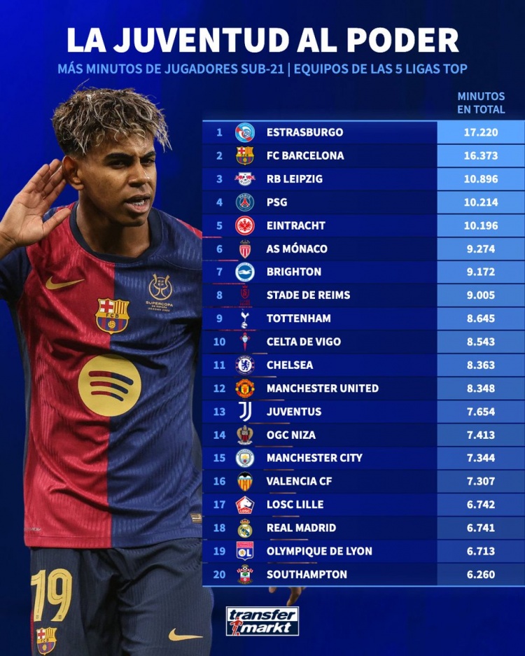 3月27日訊 德國轉(zhuǎn)會市場統(tǒng)計了本賽季五大聯(lián)賽球隊U21球員的總出場時間,并列出榜單,斯特拉斯堡居首,巴塞羅那、萊比錫排名二三位。
