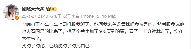“啵啵天天醬”寫道:今晚打了個(gè)車,車上司機(jī)跟我聊天,他問我來黃龍看球嗎我說是的,然后跟我說他也去看國足的比賽了。找了個(gè)黃牛加了500買到的票,看了二十分鐘就走了。實(shí)在太生氣了。