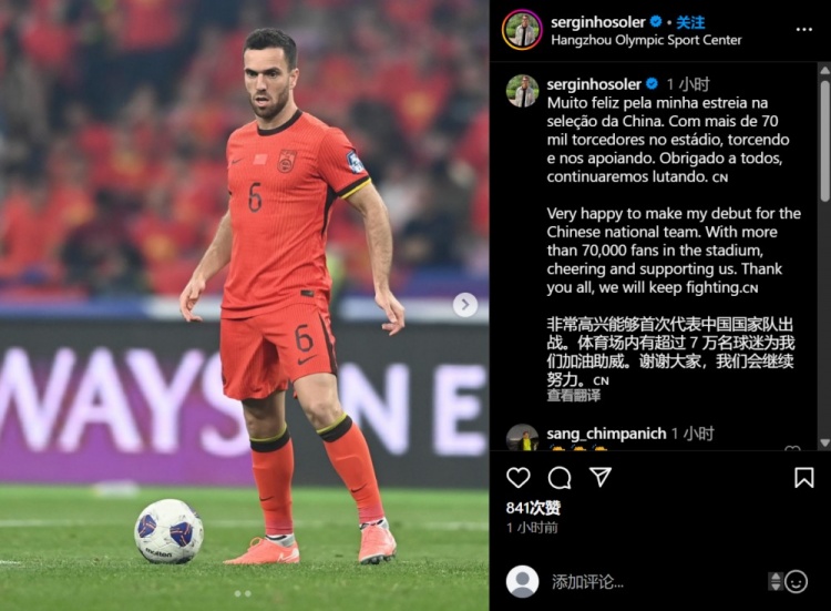 塞爾吉尼奧更新個人社媒,曬出個人賽場照,并用中英葡三種語言寫道:非常高興能夠首次代表中國國家隊出戰(zhàn)。體育場內(nèi)有超過 7 萬名球迷為我們加油助威。謝謝大家,我們會繼續(xù)努力。