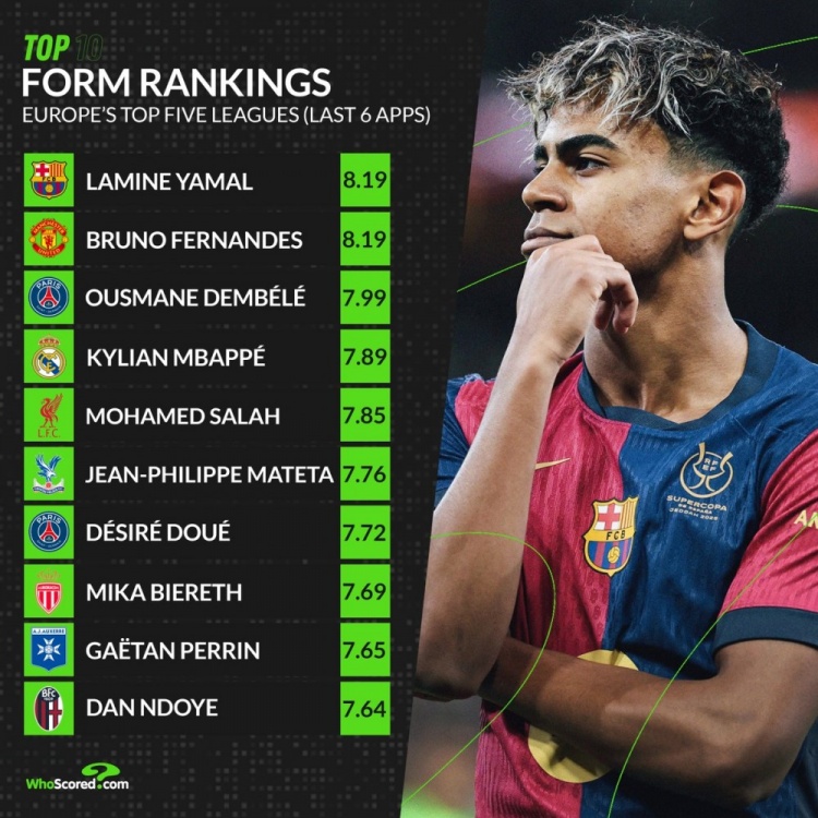 whoscored近期狀態(tài)榜:亞馬爾&B費(fèi)居首 登貝萊&姆巴佩&薩拉赫在列