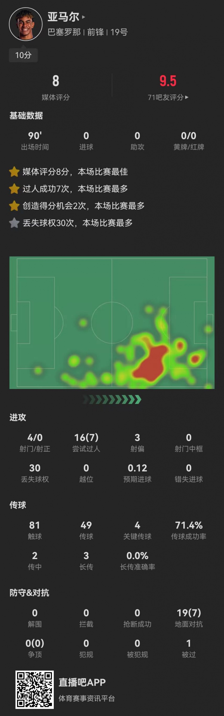 亞馬爾本場(chǎng)4射0正+4關(guān)鍵傳球 7成功過人+2造良機(jī)+30次丟失球權(quán)