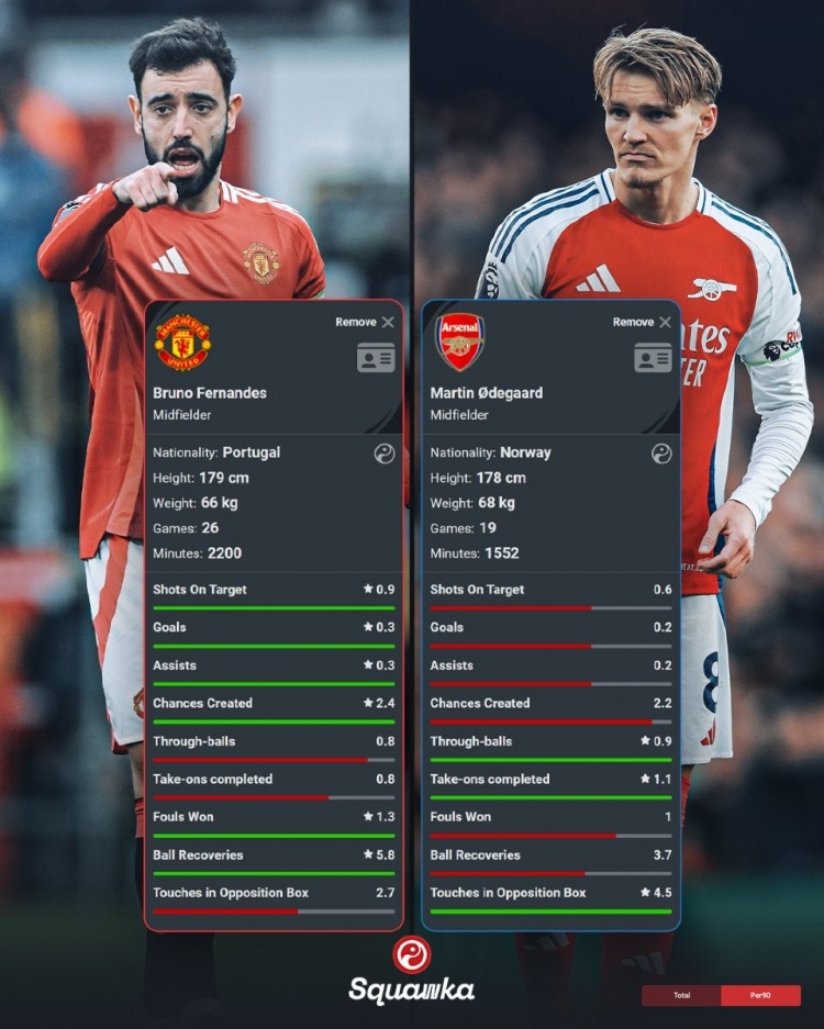3月8日訊 曼聯(lián)將在本輪英超迎戰(zhàn)阿森納,數(shù)據(jù)機構(gòu)squakwa也對比了兩隊核心的本賽季英超每90分鐘關(guān)鍵數(shù)據(jù),B費在多項數(shù)據(jù)領(lǐng)先。