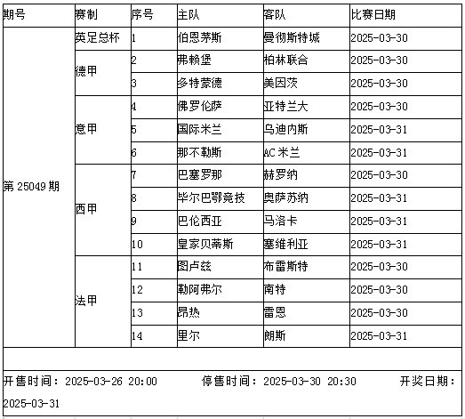 傳足勝負彩第25049期競猜賽事為英足總杯、德甲、意甲、西甲和法甲賽事,其中曼城將在英足總杯1/4決賽中對陣伯恩茅斯,意甲領頭羊國米主場面對烏迪內(nèi)斯,AC米蘭和那不勒斯展開強強對話,西甲巴薩坐鎮(zhèn)主場迎戰(zhàn)赫羅納。