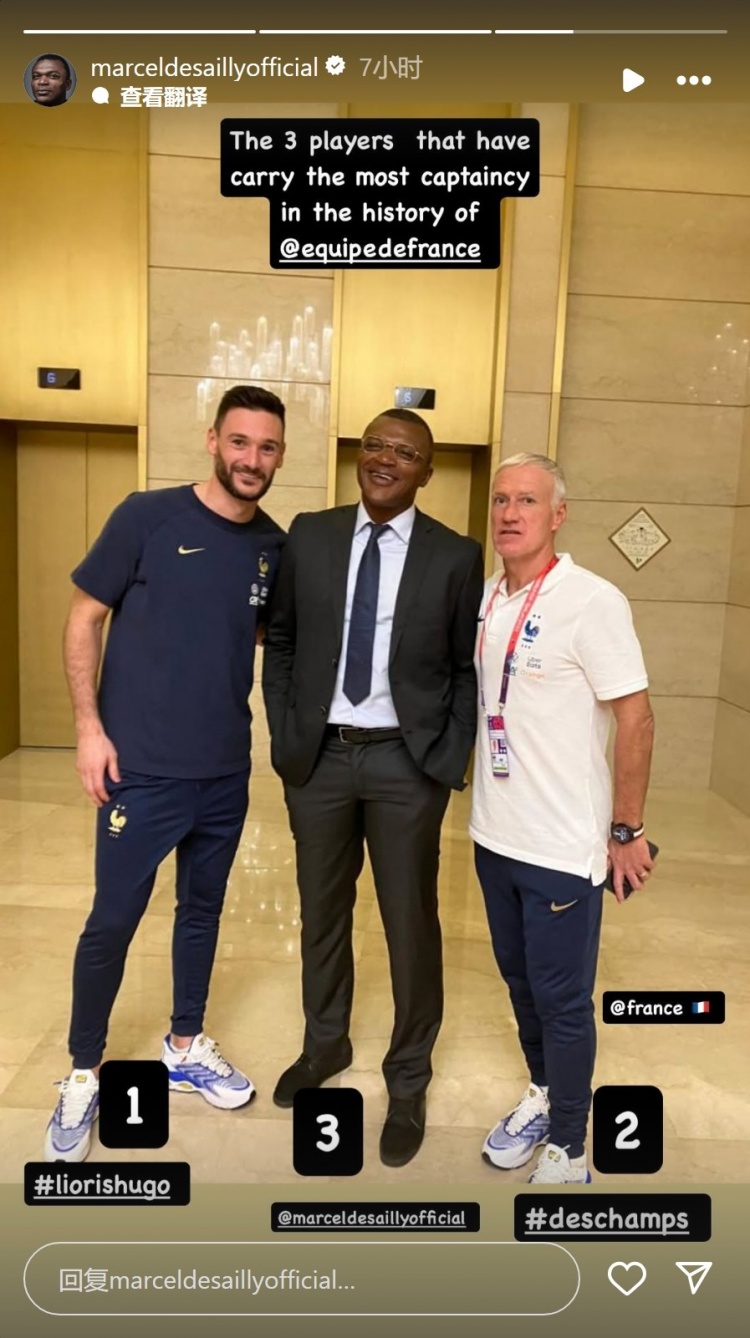 德塞利社媒曬出與德尚、洛里的合照,并配文:“法國隊史擔(dān)任隊長次數(shù)最多的三名球員?!?/p>