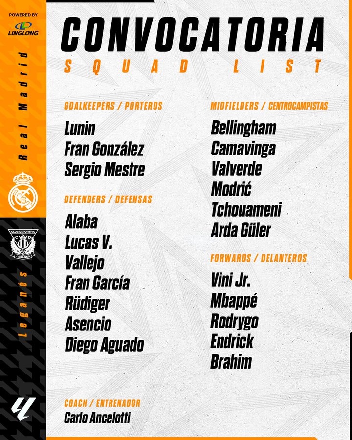 皇馬戰(zhàn)萊加內(nèi)斯名單:姆巴佩領(lǐng)銜,庫爾圖瓦、塞巴略斯缺席