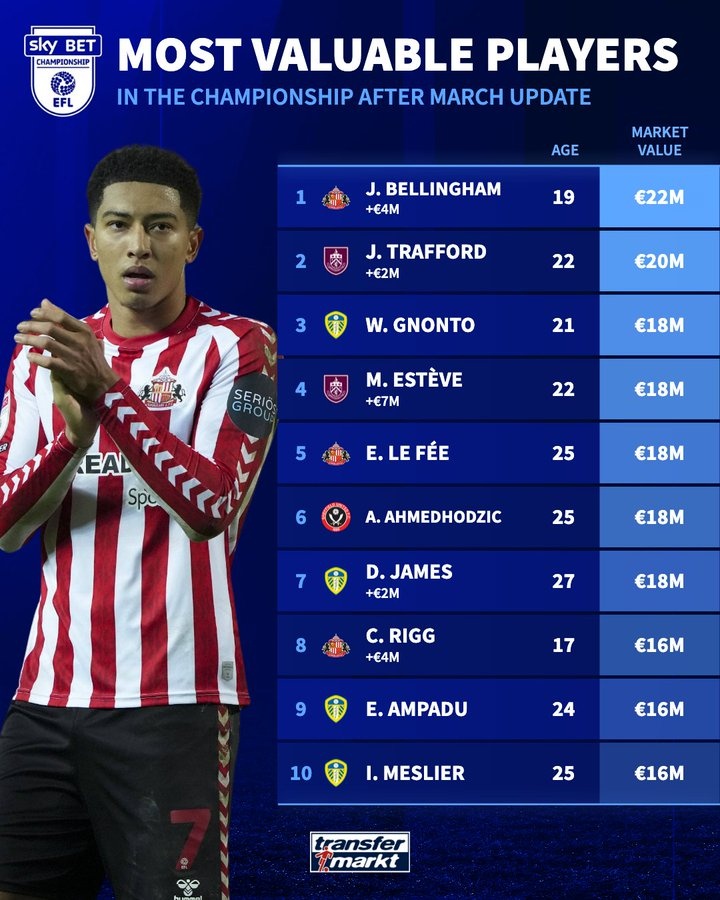 英冠球員身價(jià)排名:小貝林2200萬歐領(lǐng)跑 利茲聯(lián)4人上榜