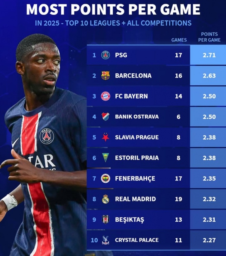 2025年各項賽事場均拿分榜:巴黎巴薩拜仁前三,皇馬費內(nèi)巴切在列