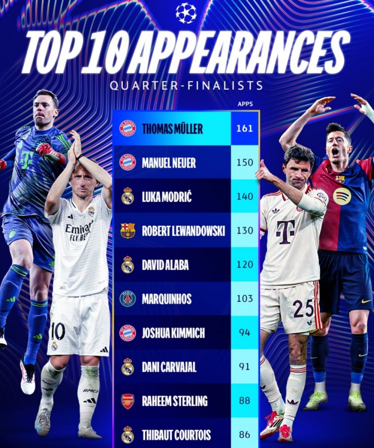 歐冠8強(qiáng)球員賽事出戰(zhàn)場次top10:穆勒161場居首,諾伊爾150場次之
