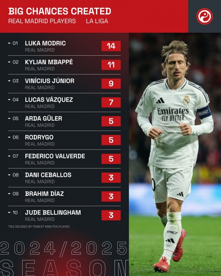 據(jù)統(tǒng)計,盡管本賽季只首發(fā)出戰(zhàn)了11場比賽,但莫德里奇本賽季在西甲創(chuàng)造機會的次數(shù)仍然是全隊最高,比第二名的姆巴佩多出三次。
