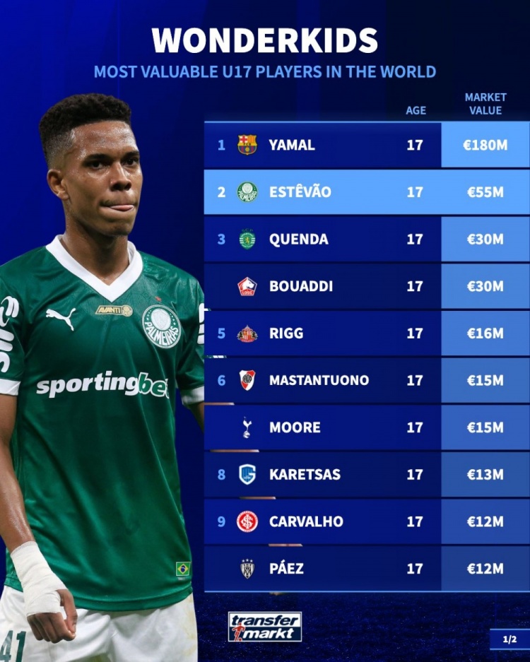 德轉(zhuǎn)U17身價(jià)榜:亞馬爾1.8億斷崖領(lǐng)跑,切爾西預(yù)訂埃斯特旺等多人