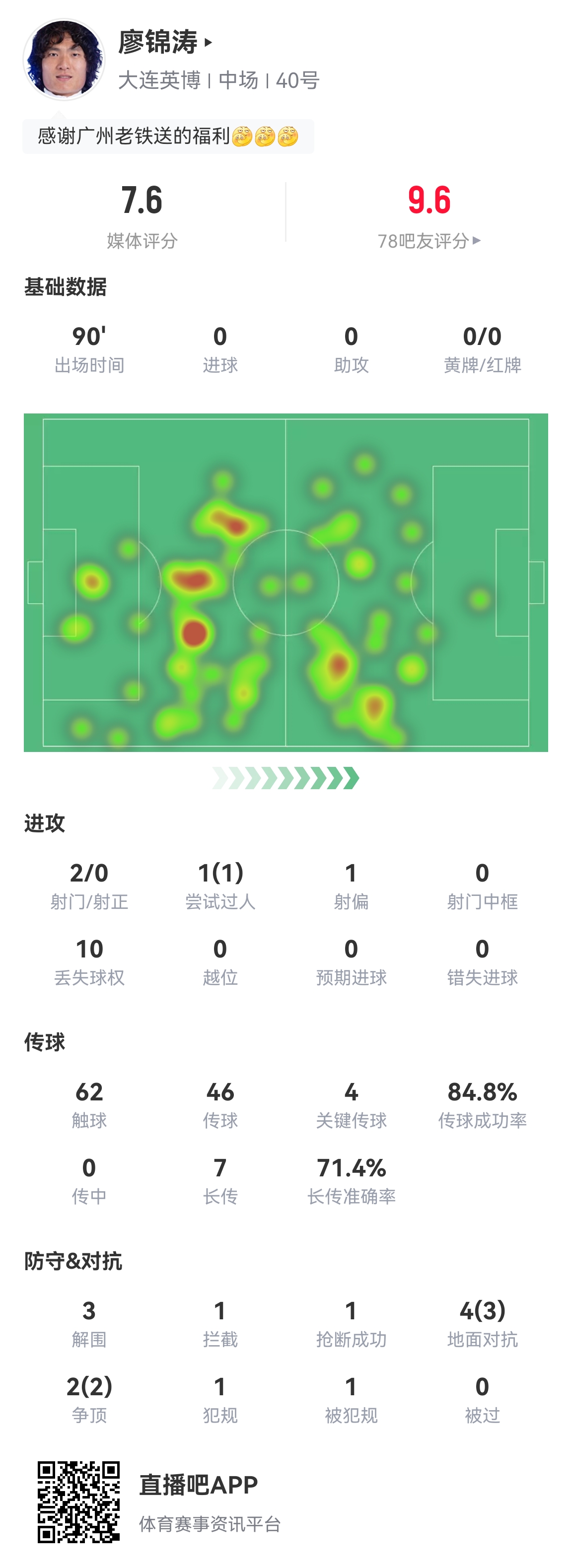 伊萬考慮下?大連英博單后腰廖錦濤攻防一體,吧友打分9.6分!