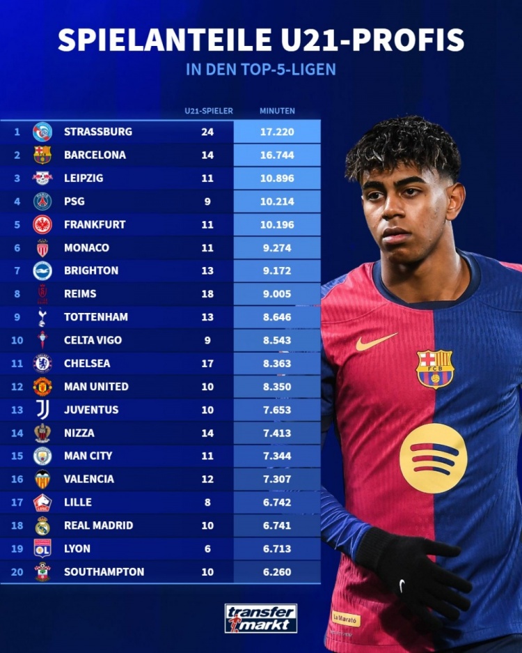 3月29日訊 德國轉(zhuǎn)會市場統(tǒng)計了本賽季五大聯(lián)賽球隊U21球員的出場時間,并列出排名,斯特拉斯堡居首,巴薩、萊比錫排名二三位。