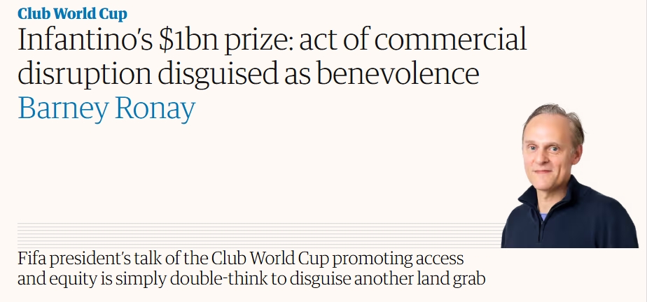 對此衛(wèi)報記者Barney Ronay撰文對世俱杯進行抨擊,認為這一賽事龐大的獎金總數(shù)看似很美好,但對足球生態(tài)存在負面影響,更是將其稱為“披著善意外衣的商業(yè)顛覆行為”。