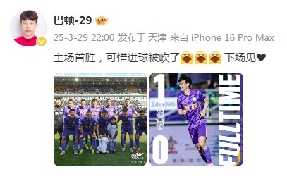 3月29日訊 在中超聯(lián)賽第3輪中,天津津門虎1-0戰(zhàn)勝青島海牛,本場比賽也是天津津門虎本賽季的主場首勝。賽后津門虎主力巴頓更新微博表示“主場首勝,可惜進(jìn)球被吹了”,同時他也不忘向球迷預(yù)告“下場見”。