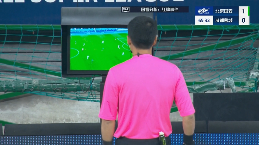 比賽第66分鐘,恩加德烏后場拿球被搶斷,無奈放倒費利佩犯規(guī),主裁馬寧起初出示黃牌,隨后VAR介入,馬寧去場邊查看后改判直紅!場上比分國安1-0蓉城。
