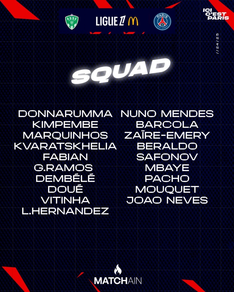 3月29日訊 北京時(shí)間明天凌晨2點(diǎn),巴黎將在法甲第27輪比賽中客場(chǎng)對(duì)陣圣埃蒂安,巴黎公布了此役的球員名單,登貝萊、杜埃、克瓦拉茨赫利亞在列,阿什拉夫、李剛?cè)?、馬尤盧缺席。
