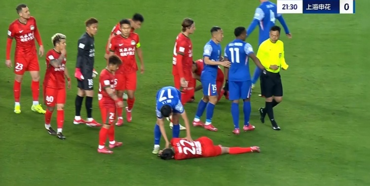 第23分鐘,申花左側(cè)角球機(jī)會(huì),禁區(qū)內(nèi)卡位時(shí)路易斯故意推搡黃銳烽,后者倒地,主裁黃牌警告路易斯↓