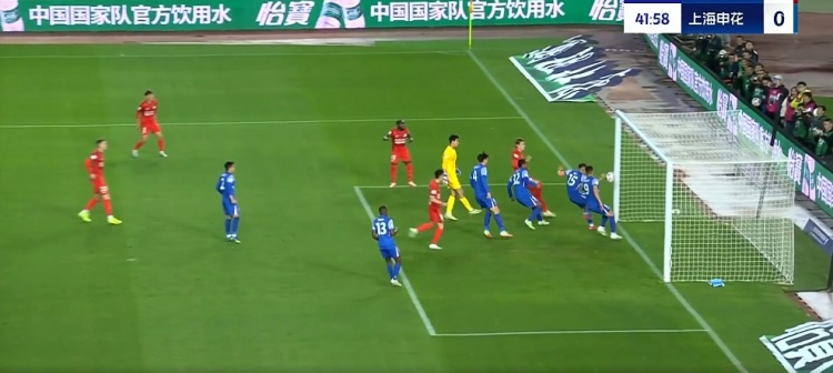 第39分鐘,申花前場(chǎng)連續(xù)的進(jìn)攻,吳曦左側(cè)肋部的凌空抽射被門(mén)將抱住↓
