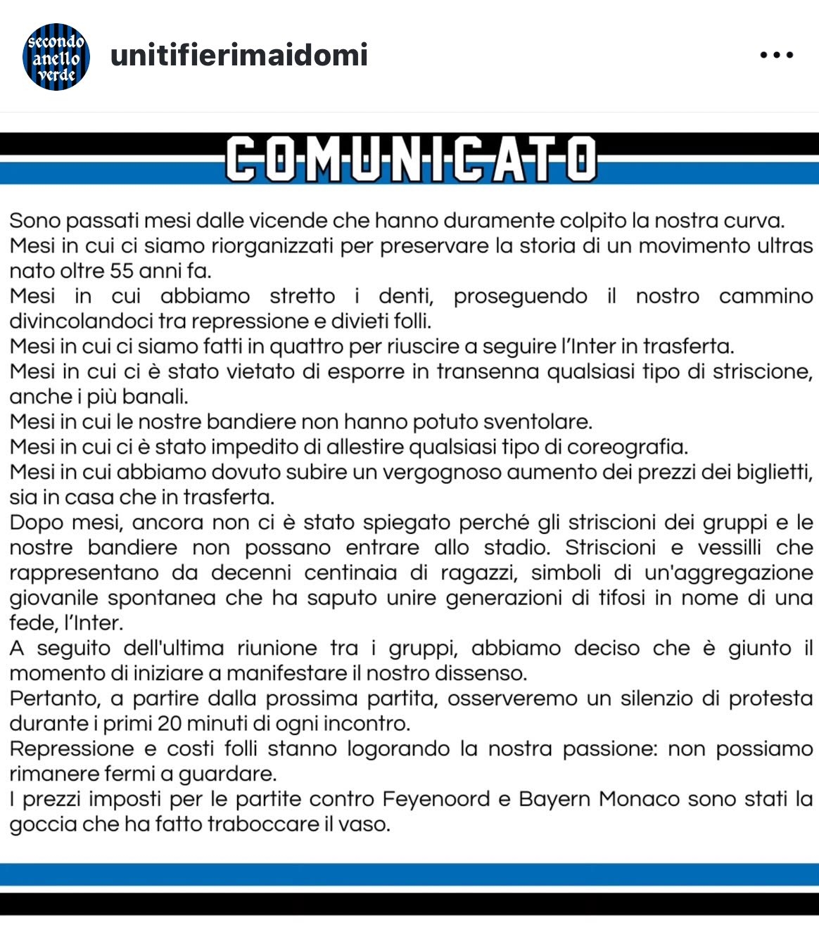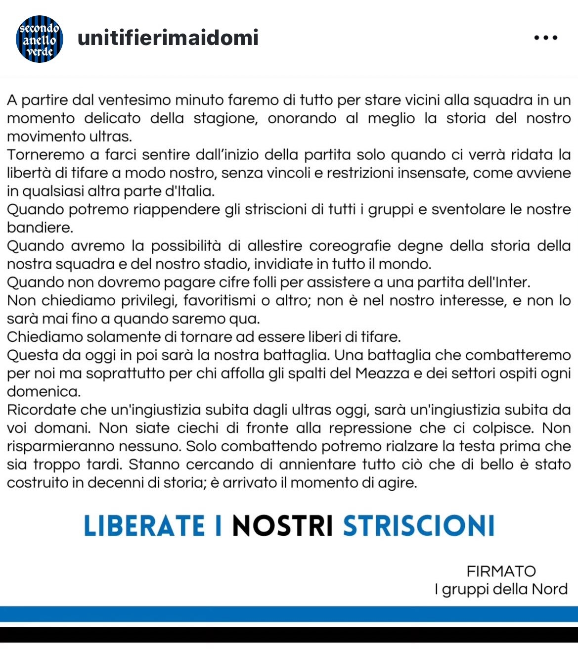 幾個(gè)月已經(jīng)過去了,但我們?nèi)匀粵]有被告知為什么這些標(biāo)語和旗幟不能被帶進(jìn)球場(chǎng)。過去幾十年中,這些標(biāo)語和旗幟象征著球迷們的自發(fā)聚集,能夠以信仰國米的名義團(tuán)結(jié)一代又一代的球迷們。