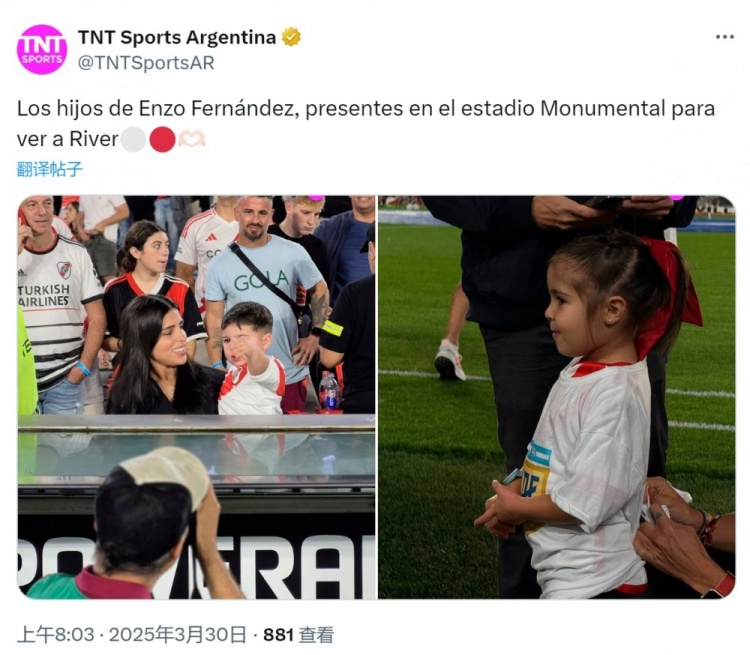 瓦倫蒂娜帶著孩子們來到紀(jì)念碑球場,現(xiàn)場觀看河床隊(duì)的比賽。恩佐出身于河床青訓(xùn),他與瓦倫蒂娜去年曾分手,兩人今年1月份宣布復(fù)合。