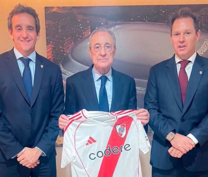 布里托與皇馬主席弗洛倫蒂諾合影,并向后者贈(zèng)送了河床球衣。
