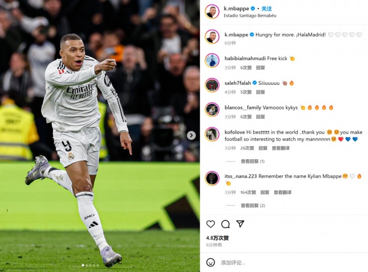 姆巴佩在賽后同社媒曬出自己進(jìn)球后的慶祝照并配文:“渴望贏得更多!馬德里前進(jìn)!”