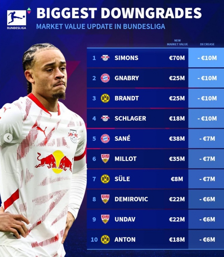 德甲身價(jià)貶值榜:西蒙斯&格納布里下跌1000萬,薩內(nèi)&聚勒降700萬