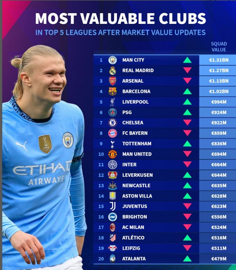 五大聯(lián)賽球隊(duì)最新身價(jià)榜:曼城壓皇馬居首,阿森納、巴薩分列三四
