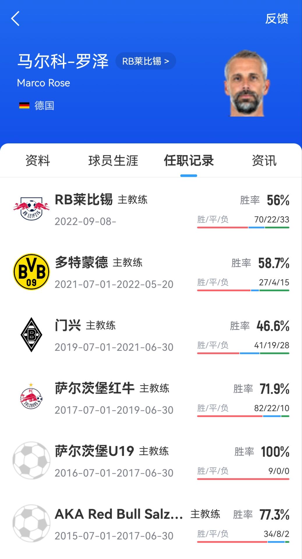 現(xiàn)年48歲的羅澤在2022年9月成為RB萊比錫萊比錫主帥,帶隊戰(zhàn)績127場72勝22平33負。在羅澤執(zhí)教的第一個賽季,RB萊比錫就拿下了德國杯冠軍,并在2023/24賽季3-0完勝拜仁,拿到了德超杯冠軍。