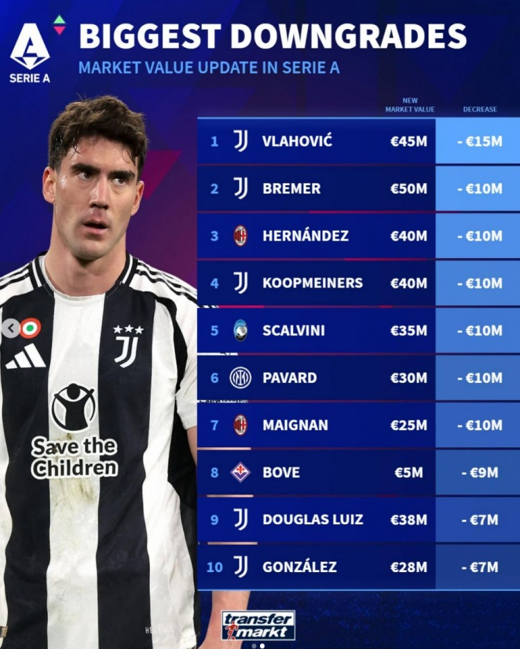 3月30日訊 德轉(zhuǎn)此前更新了意甲球員身價(jià),并盤點(diǎn)了此次更新身價(jià)下跌最多的前十榜單,其中弗拉霍維奇居首,尤文球員在前十中占據(jù)5席,具體球員目前身價(jià)以及跌幅如下: