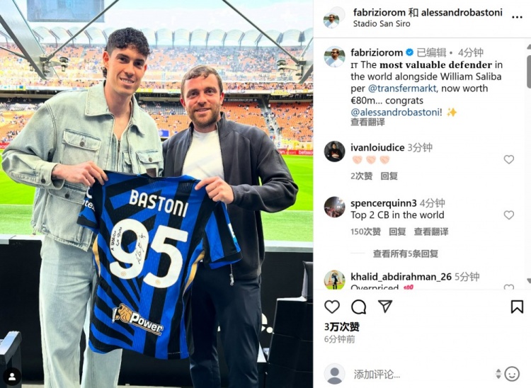 羅馬諾社媒曬與巴斯托尼合影:8000萬歐,世界身價并列最高后衛(wèi)