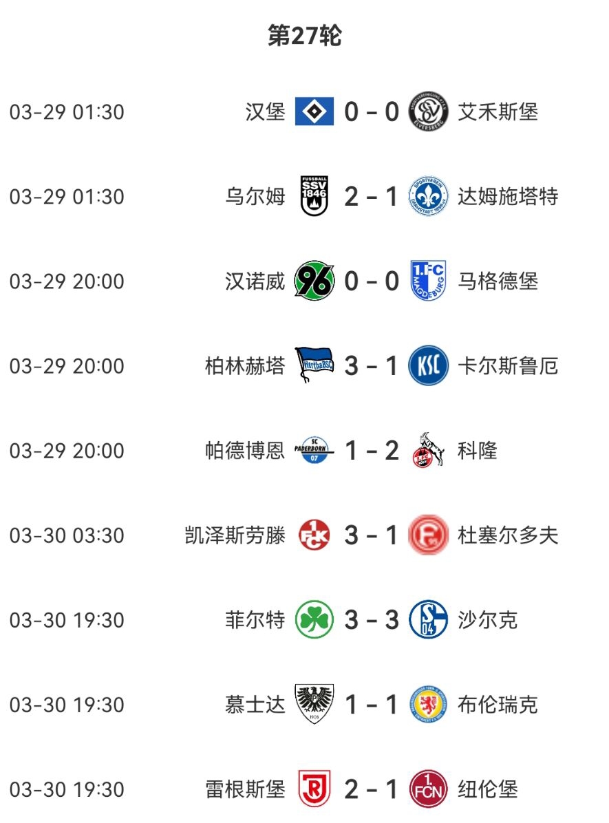 03月30日訊 德乙結束第27輪比賽,本輪積分榜前中段多支球隊丟分,原本榜首的漢堡戰(zhàn)平積分被科隆反超,k神執(zhí)教的紐倫堡不敵副班長雷根斯堡,錯失了寶貴的追分機會。