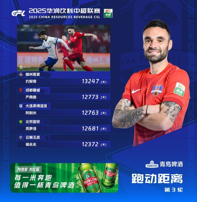 中超第3輪跑動(dòng)距離榜:約契奇超1.3萬(wàn)米居首,嚴(yán)鼎皓第2侯永永第5