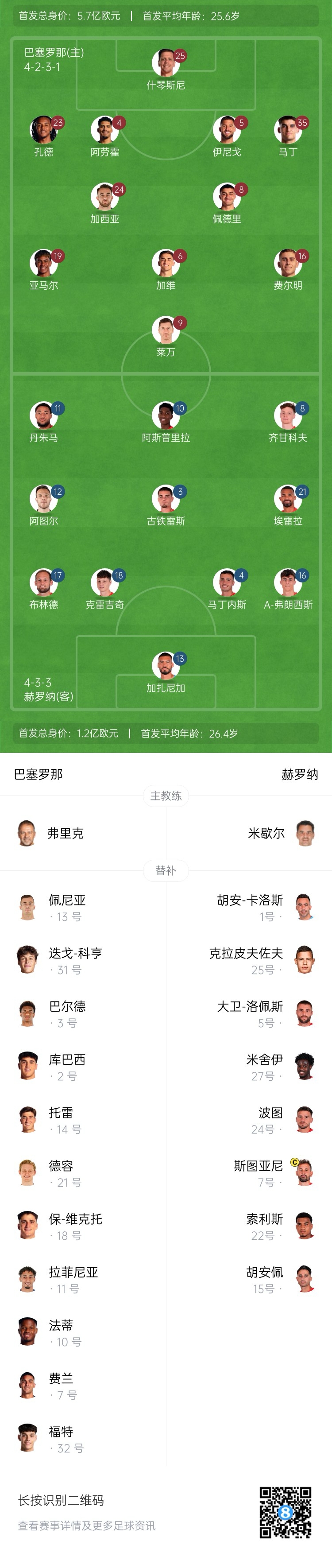 巴薩替補(bǔ):13-佩尼亞、31-迭戈-科亨、2-庫巴西、3-巴爾德、14-巴勃羅-托雷、18-保-維克托、21-德容、7-費(fèi)蘭-托雷斯、10-法蒂、11-拉菲尼亞、32-赫克托-福特