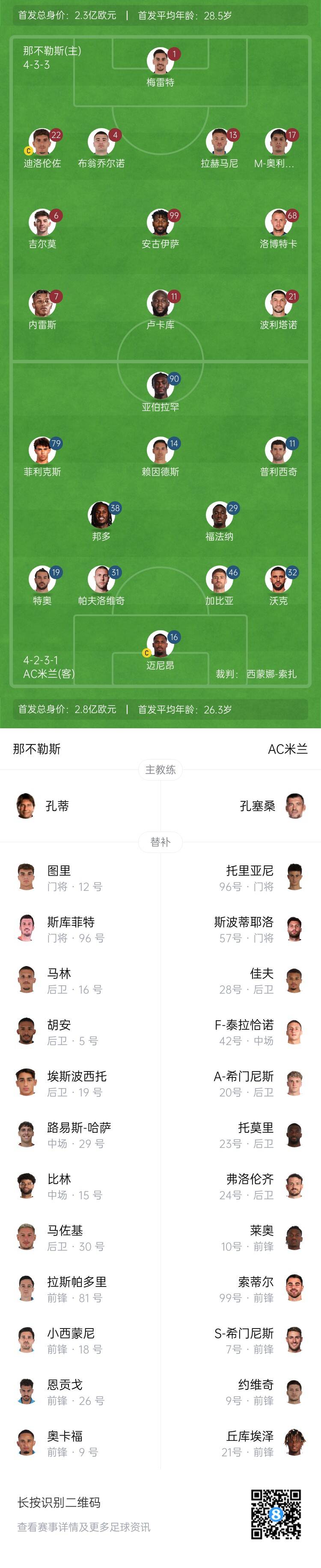 3月31日訊 意甲第30輪,那不勒斯主場對陣AC米蘭。賽前,官方公布了本場的首發(fā)名單。