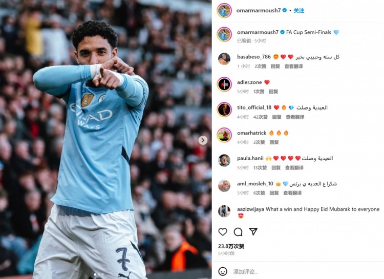 馬爾穆什也在賽后通過社媒曬出自己的慶祝照,并配文:“足總杯半決賽!”