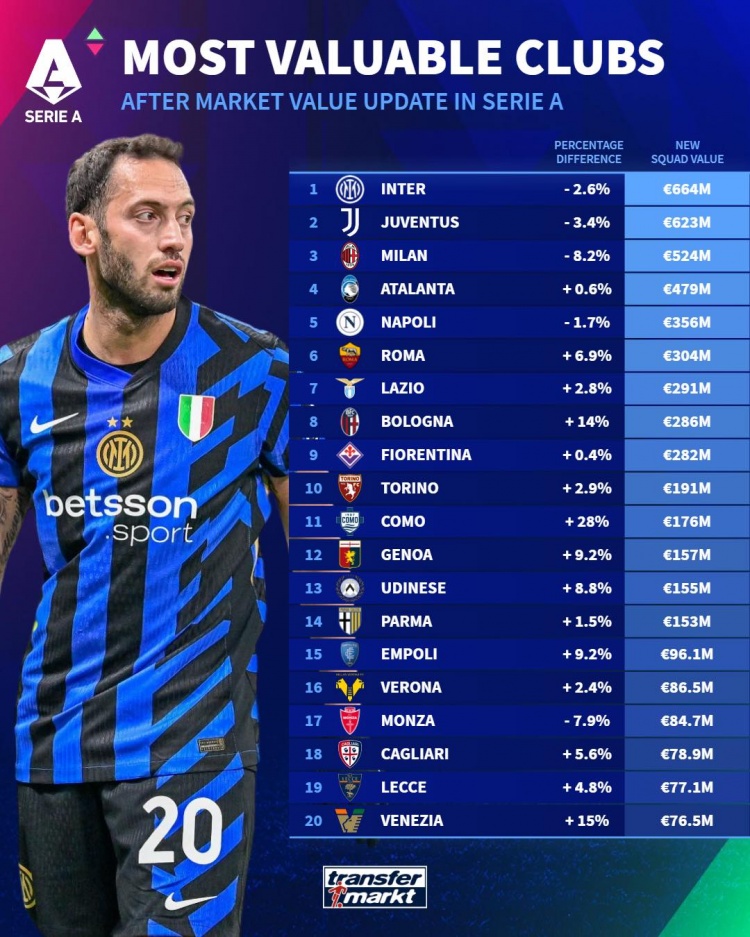 意甲球隊德轉身價排名(括號內為變動幅度)